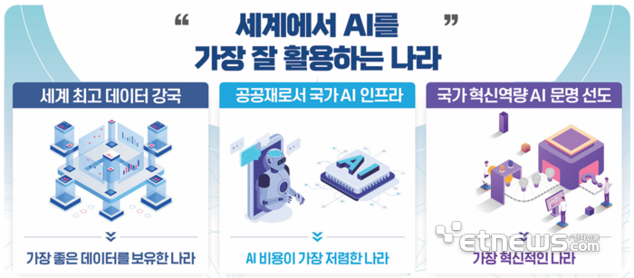 이 외에도 지역문제 해결을 위한 ’17개 권역별 AI 팜 구축’, AI 데이터 유통·거래에 블록체인 기반 토큰 이코노미를 적용한 ‘AI 토큰 경제’ 등이 제시됐다.